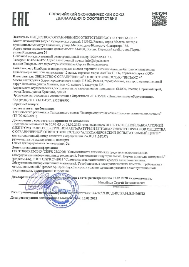 | Совместимость | ONVIF (Profile S, Profile T) 22.06, API (CGI) |
