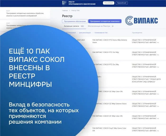 Это — результат второго этапа плана, который компания ВИПАКС задекларировала в 2025 году: регистрация ключевых решений собственного производства во всех обязательных государственных реестрах. Теперь в Реестре ПАК представлены наиболее востребованные модели оборудования ВИПАКС, применяемые в проектах систем видеонаблюдения различного масштаба как в промышленности, так и в «Умном городе»/ «Безопасном регионе».