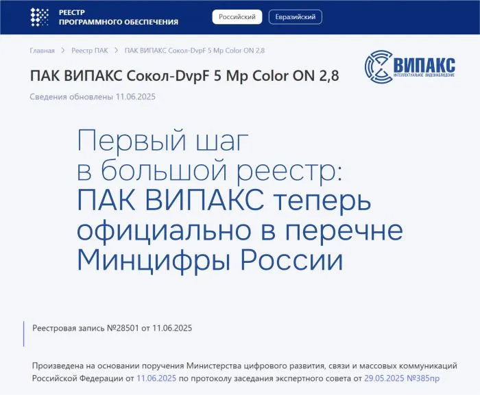 Программно-аппаратный комплекс ВИПАКС Сокол-DvpF 5 Mp Color ON 2,8 внесён в Единый реестр российских программ для ЭВМ и баз данных Минцифры России. Соответствующая запись под номером №28501 от 11.06.2025 внесена в Реестр российского программного обеспечения, допущенного к использованию на объектах государственного значения и объектах КИИ.